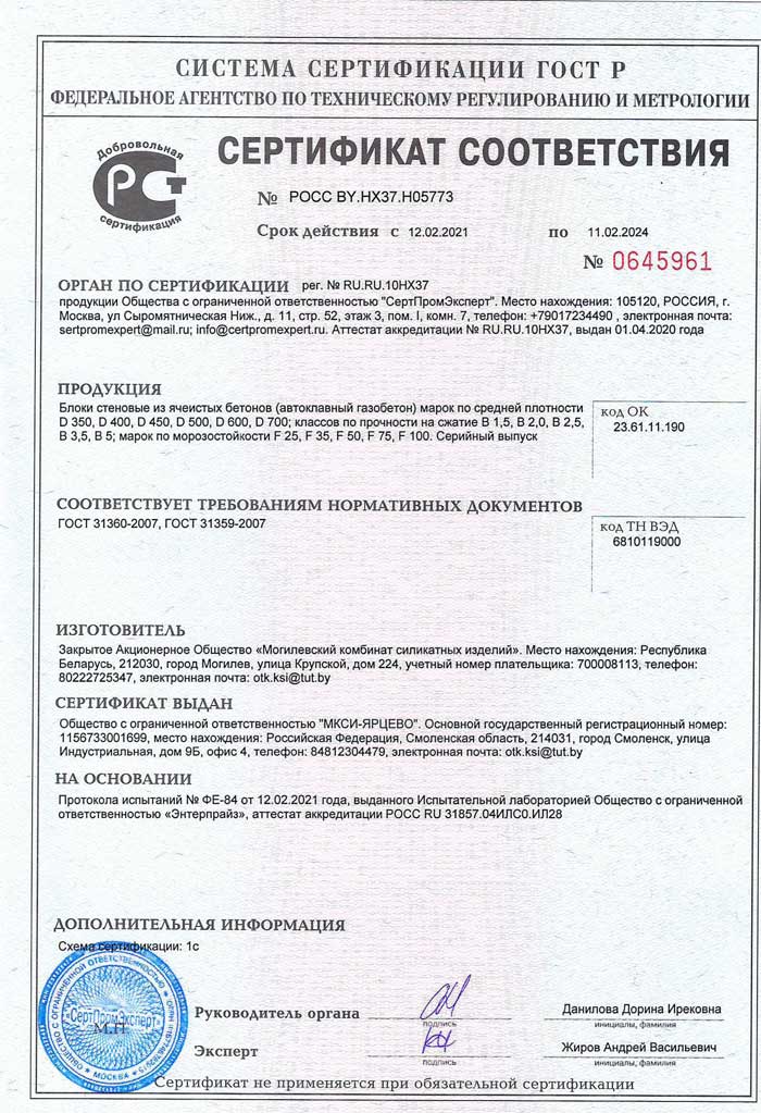 Плотность газобетона обозначается буквой D и числом, которое указывает на среднюю плотность материала в кг/м³. Газобетон Могилевский КСИ D400 имеет плотность 400 кг/м³, что обеспечивает оптимальное соотношение прочности и теплоизоляции.